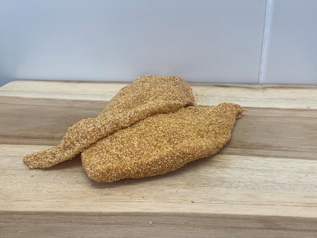 Lekker dun gesneden plakje kipfilet, Vorstelijk met goud gepaneerd.